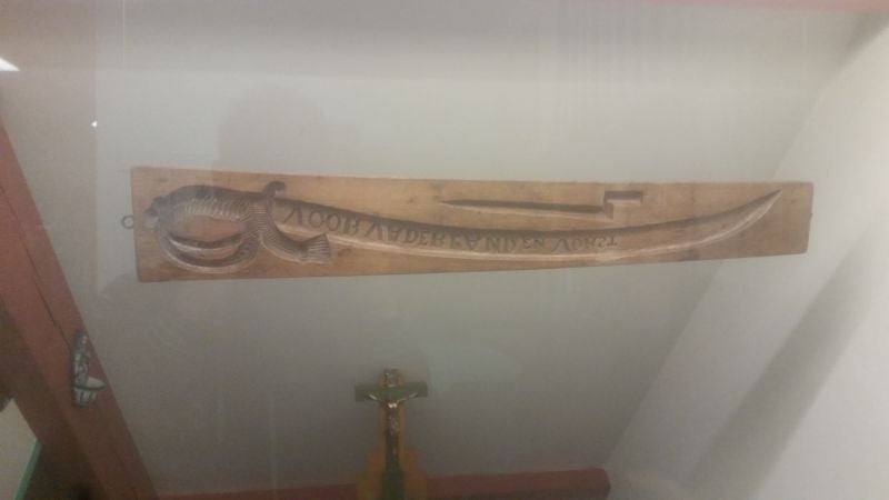 4. F. De figuur in het hout en de tekst: Voor vaderland en vorst.